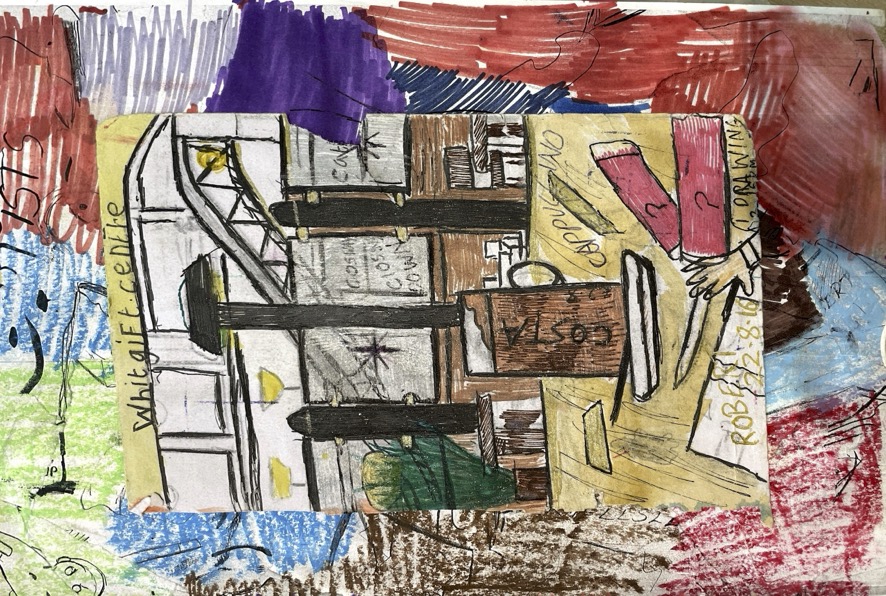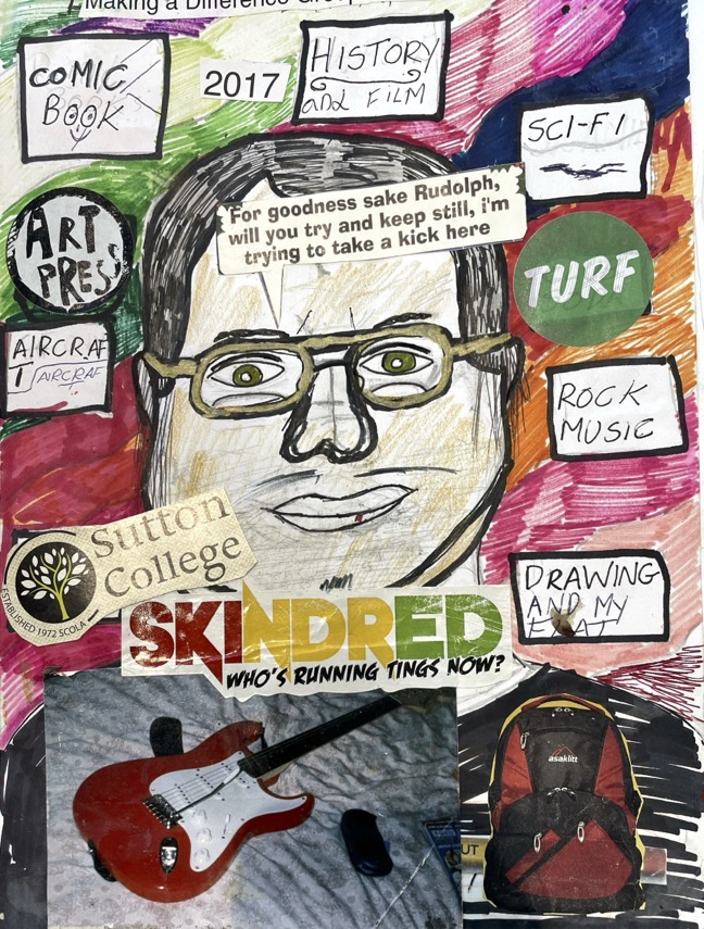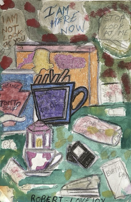 Robert has been a member of the MOSS collective since 2013. He draws artistic inspiration from his daily life, exploring various parts of Croydon and documenting his journeys. His work is influenced by his passion for science fiction, vampires, rock music, local history, and his family. Robert’s art serves as an expressive outlet for his emotions, from moments of sadness to his unique sense of humour. As a dedicated comic creator and poet, he frequently merges photographs and text to create his pieces. Using materials such as glitter pens, felt tips, pencils, and found objects . In 2024, he celebrated a milestone with his first solo exhibition at Turf Projects.