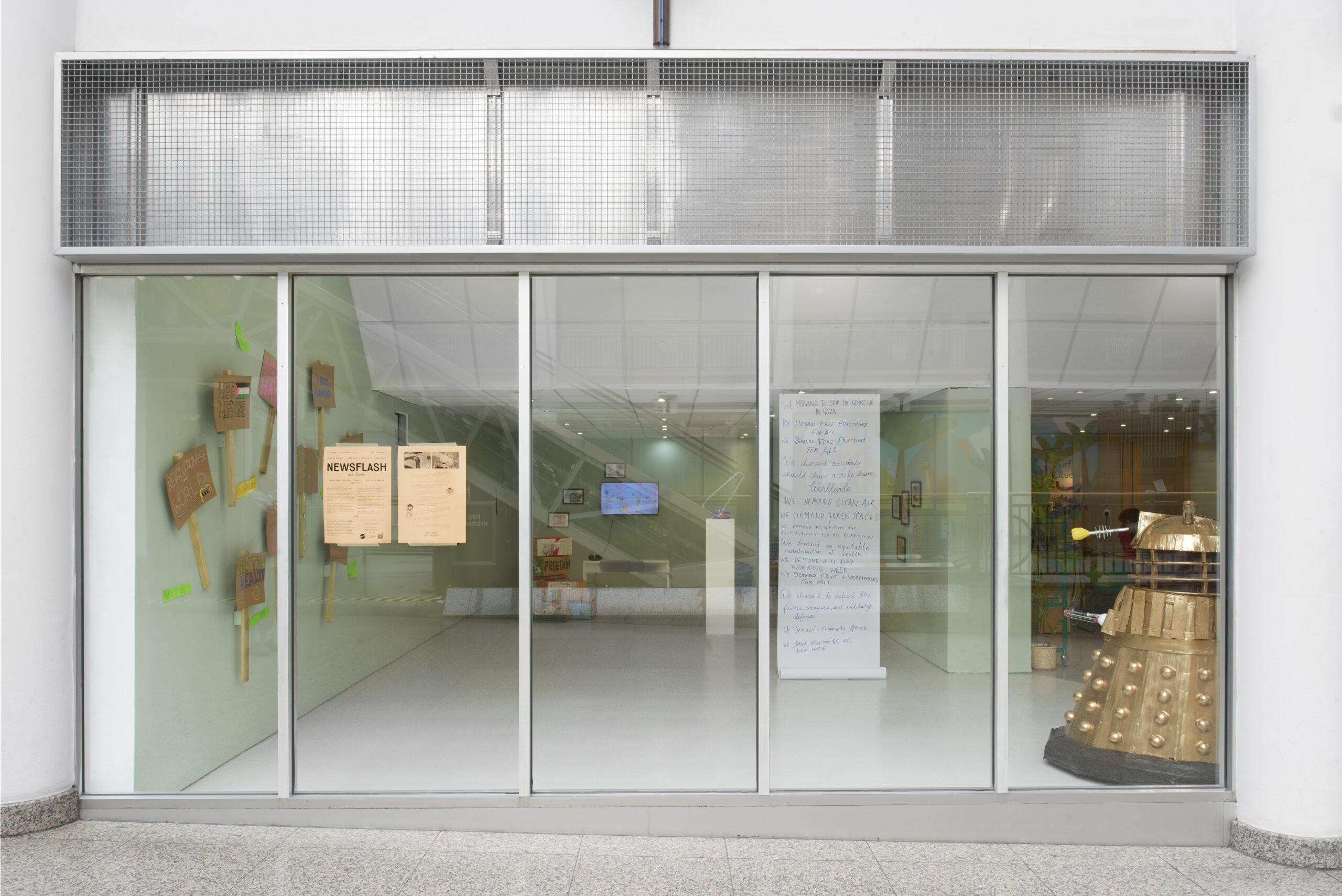 The exhibition was turned into a place to reflect on how some people are less fortunate and face war, or are marginalised or disadvantaged around the work and not able to voice it or do anything about it. The list of pressing issues ranged from stopping wars abroad to having a free education and a better environment locally. However all these issues came together to give a voice to people who may not be able to be heard and issues that are not being addressed promptly. In my opinion, that was a focal point for NEWSFLASH.
